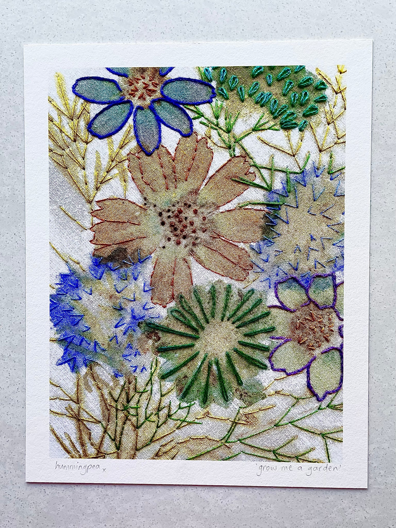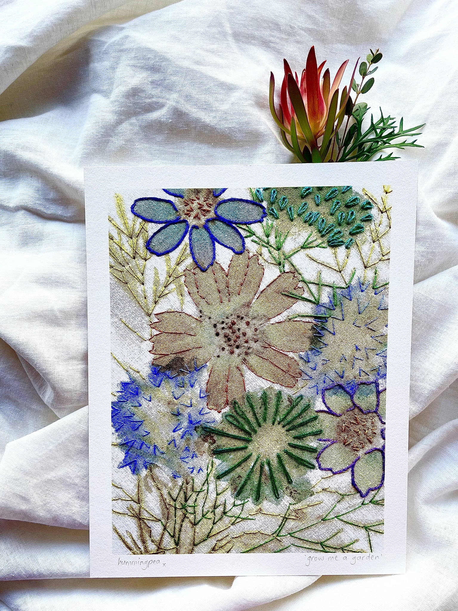 This is a fine art print of my original artwork using flowers and embroidery thread. The artwork was made using flower pounding techniques of transferring the pigments of fresh flowers onto prepared fabric using hammers and spoons. I have then hand embroidered embellishments over the top. There is no paint used in this work. It’s then been photographed, and printed onto high quality Ilford Textured Cotton Rag 310gsm paper.
