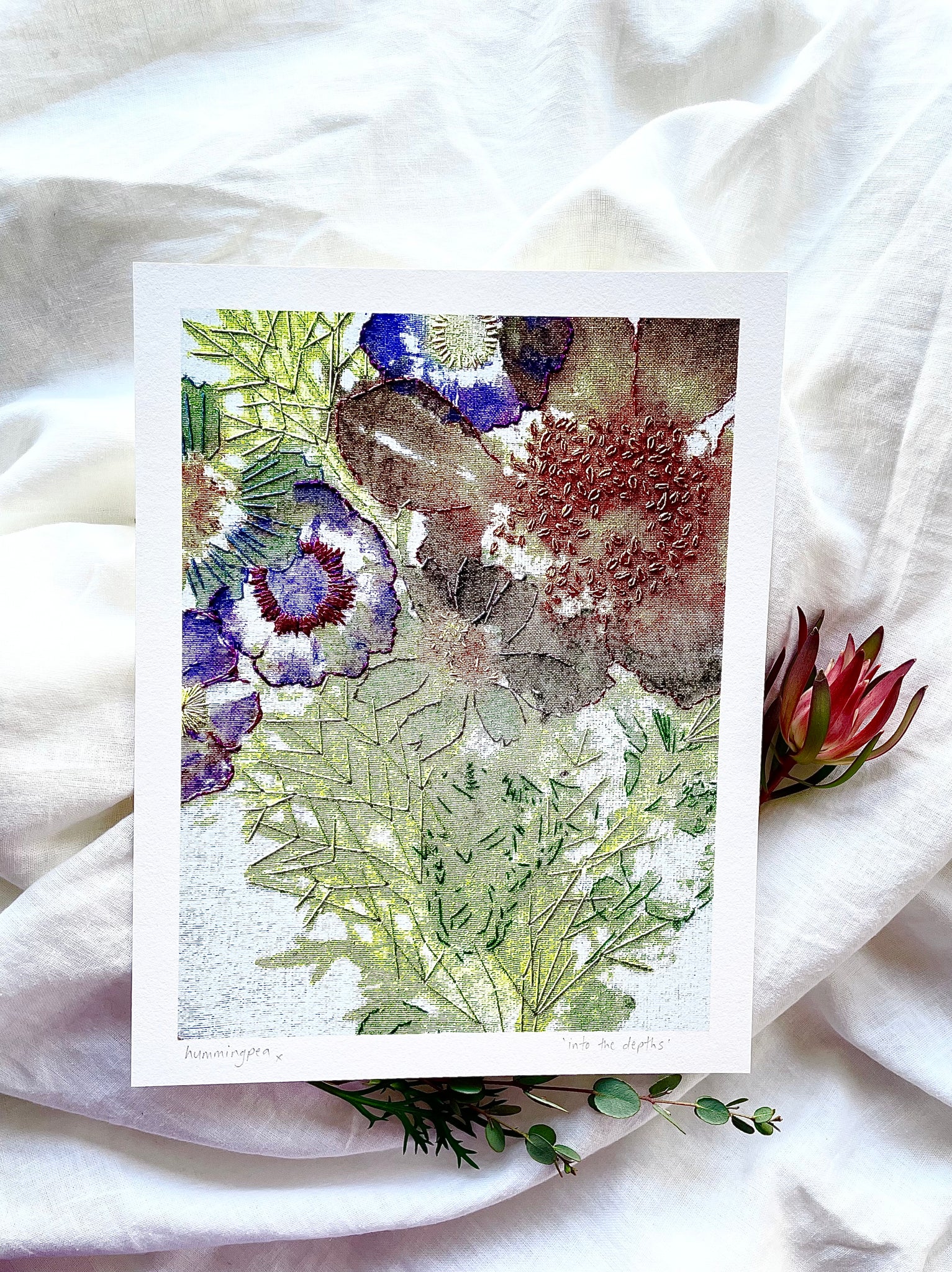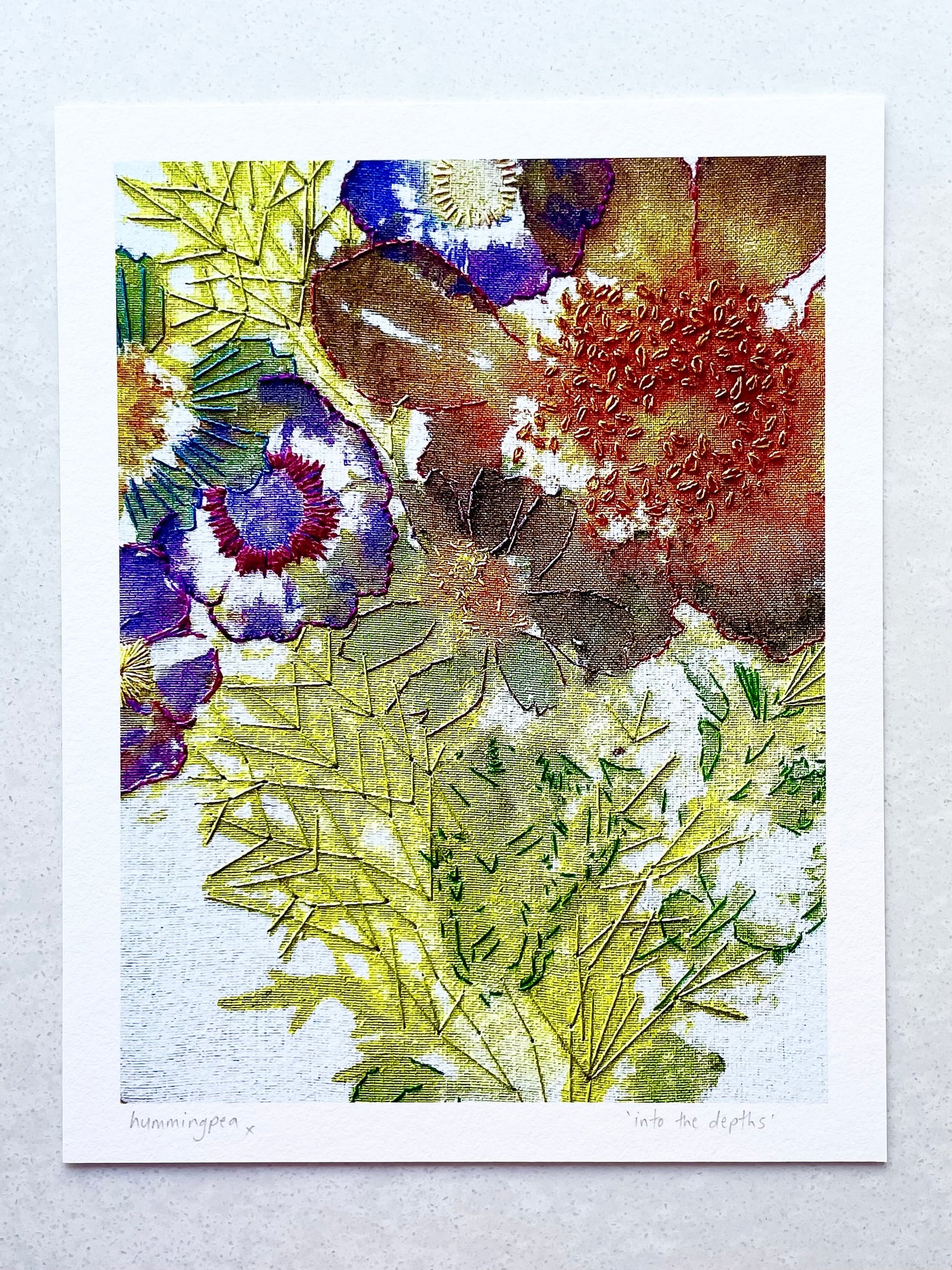 This is a fine art print of my original artwork using flowers and embroidery thread. The artwork was made using flower pounding techniques of transferring the pigments of fresh flowers onto prepared fabric using hammers and spoons. I have then hand embroidered embellishments over the top. There is no paint used in this work. It’s then been photographed, and printed onto high quality Ilford Textured Cotton Rag 310gsm paper.